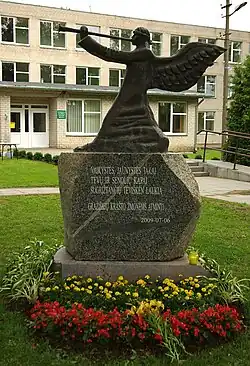After World War II, the Lithuanian partisans of the Vytautas Brigade of the Tauras military district were active in the area. In 1947 the first library was established, in 1959 a cultural house, post office and clinic were set up in the former clergy house. In 2001, the coat of arms of Gražiškiai was approved by the decree of the President of Lithuania. In July 2002, the town celebrated the 400th anniversary of its founding. In 2009, on the initiative of people from Gražiškiai, a Monument of the Angel inviting people to return to their homeland was unveiled.[3]