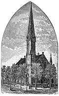 The church building was designed by architect Richard Upjohn and built in 1845–46, when the area had a much more residential character. It is a relatively simple expression of Gothic Revival architecture, and is notable as the first building in which Upjohn used asymmetry in a church's massing.[3] In 1912, Cram, Goodhue & Ferguson added a parish house[4] which connects with the church through several narrow, twisting stairwells and passages.[5] The parish house was remodeled and enlarged in 1950 by Harkness & Geddes.[4]