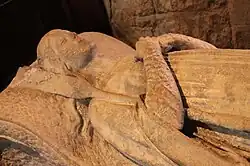 However, Darling's condition declined and she was conveyed to the place of her birth in Bamburgh, where she died, aged 26, of consumption in October 1842. She is buried in the churchyard of St Aidan's Church, Bamburgh. The Monument to Grace Darling was completed in 1842. It represents a sleeping effigy of her holding an oar, and lies to the north of her grave at the western edge of the churchyard so it would be visible to passing seafarers.[11] The original effigy, which was sculpted by Charles Raymond Smith son of James Smith,[12] was moved into the church in 1895 due to weathering.