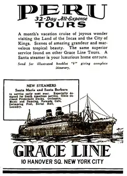 The Grace Line began service in 1882, with ports of call between Peru and New York City. The main source of shipping revenue was from the exporting of guano from the Chincha Islands of Peru to fertilizer manufacturers in the United States.[2] Regular steamship service was established in 1893, with a subsidiary called the New York & Pacific Steamship Co. The first ship to test the route was SS Mount Tabor. Steamships utilized the shorter route of the Strait of Magellan, whereas a sailing ship needed to go past Cape Horn.[3]