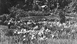 E. Lewis Sturtevant died in 1898, and in 1901 Grace Sturtevant and her half-brother Robert jointly bought a property named Wellesley Gardens in Massachusetts. In 1910, Grace began hybridizing irises, beginning with varieties imported from Europe, and in 1912, her first known iris cross flowered.[1][3] By 1915, Wellesley Gardens became a showcase of iris plantings and a popular local destination during bloom season.[1][4] In 1917, Grace took three of her hybrids— the yellow 'Afterglow' and 'Shekinah', and the lavender 'B.Y. Morrison' (named in honor of horticulturist Benjamin Y. Morrison, the first director of the U.S. National Arboretum)—to the Massachusetts Horticultural Exhibition, where they all won medals.[5] This success laid the cornerstone of her reputation as a notable iris breeder.[1]