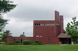 Architecturally, the postmodern brick structure is minimalist. It is reminiscent of the exterior simplicity of the Rothko Chapel in Houston built only a few years earlier, while its twin steeple foreshadows the deconstructivist style in architecture that began a decade later. The chapel houses Aaron Sherer's "The Process of Becoming", a canvas wall hanging employing a mix of colorfully painted ribbons.