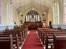 The transepts are divided internally to form vestries. The southern portions of both transepts are integrated with the body of the church and contain pews, and a pipe organ is located in the eastern transept. The vestries contain stair access to the choir stalls.[1]