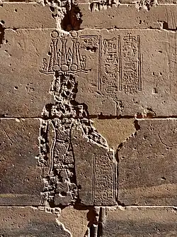 Mandulis was one of these Nubian deities that were also worshipped throughout Egypt.[1] Mandulis was relatively prominent, and was seen at least in southern Egypt as a son of the god Horus. Greek and Roman travellers and authors saw Mandulis as a form of the Greek god Aion.[7] Due to its geographical location, it is unclear whether Philae was staffed by Egyptians or Nubians.[8] As can be gathered from the inscriptions, they were written by a priest of Isis named Nesmeterakhem.[1] Nesmeterakhem was at least a third-generation priest of the temple, his father Nesmeterpanakhet and his grandfather Pakhom also having been priests at Philae.[4] In the inscriptions, Nesmeterakhem is described as "Scribe of the House of Writings", significant since it demonstrates that he worked with the sacred writings (i.e. hieroglyphs).[1] Traditionally, hieroglyphs were seen as the actual writings of the gods.[9]