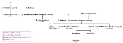 Among the later inscriptions at Philae is the last known inscription in demotic,[10] carved on the roof of the porch of the great temple dedicated to Isis and dated to 11 December 452. This very faint inscription reads "the feet of Panakhetet the lesser", presumably originally having been accompanied by a drawing of feet, commemorating a pilgrimage to the temple.[11] The last known inscription to mention Osiris, written by a pilgrim and not a priest, was written in Greek on 20 December 452 at the entrance of the Abaton by "Smetkhem, son of Pakhoumios". This inscription records that Smetkhem came to the temple with his brother Smeto and "fulfilled his duty", and thanks both Isis and Osiris "for the good". The last known inscription from Philae to mention any pagan religious activity is from the exterior wall of the temple of Isis. Dated to 456/457, the preserved portion of this damaged inscription reads "when Smet was archprophet, Pasnous, son of Pakhumios, was first president of the cult association".[14] Based on the names recorded in the different late inscriptions, it appears that many of the writers were part of the same family;[12][14] it is unclear whether the late worship of the Egyptian deities extended outside of this single family.[14]