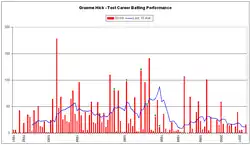 He scored more than 40,000 first-class runs,[2] mostly from number three in the order, and he is one of only three players to have passed 20,000 runs in List A cricket (Graham Gooch and Sachin Tendulkar are the others) and is one of only twenty-five players to have scored 100 centuries in first-class cricket.[3] He is the only cricketer who scored first-class triple hundreds in three different decades (1988, 1997 and 2002).[4] He is the second highest run scorer of all time after Graham Gooch,[5] and the second highest century scorer after Jack Hobbs.[6] Despite these achievements, he is commonly held to have underachieved in international cricket, a view based on comparison of Hick's overall first-class batting average of 52.23 vis-à-vis his Test average of 31.32.