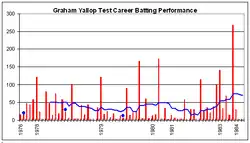 Yallop's best performances as a Test cricketer came during the 1983–84 season, when Pakistan toured Australia. In the first Test he made 141, taking part in a 259 run partnership with debutant Wayne Phillips, an Australian record for any wicket against Pakistan.[66]
