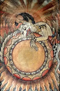 Beliefs surrounding eclipses are regarded by scholars to be closely associated with Vedic deities, and were significant in both astrology and astronomy.[3][4] The origin of eclipses is explained in the Puranic legend of the Samudra Manthana, the churning of the ocean. When the asura named Rahu attempted to pose as a deva to receive amṛtam, the nectar of eternal life, Surya and Chandra, the deities of the Sun and the Moon, alerted Mohini, the incarnation of Vishnu. Mohini promptly employed her discus to behead the asura, but he had already partaken the nectar, and had become immortal. Rahu's head was exiled to the heavens, and due to the two celestial deities' part in his decapitation, he is said to occasionally swallow them whole for a given period of time, causing the solar and the lunar eclipse.[5]