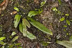 The plant is a very small epiphytic fern. It has a short rhizome with dark brown, pointed scales. Its simple fronds combine a short stipe with a narrowly oblanceolate lamina 2–8 cm long and 0.3–0.8 cm wide.[1]