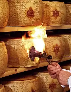 Like Parmesan, Grana Padano is a semi-fat hard cheese which is cooked and ripened slowly for at least nine months. If it passes quality tests, it is fire-branded with the Grana Padano trademark. The cows are milked twice a day.[7] Milk produced in the evening is skimmed to remove the surface layer of cream and mixed with fresh milk produced in the morning. The partly skimmed milk is transferred into copper kettles and coagulated; the resulting curd is cut to produce granules with the size of rice grains, which gives the cheese its characteristic texture, and then warmed to 53–56 °C (127–133 °F). It is produced year-round, and varies seasonally as well as by year. Although similar to Parmesan cheese, the younger Grana Padano cheeses are less crumbly, milder, and less complex in flavor than the better-known, longer-aged Parmesan.[1]