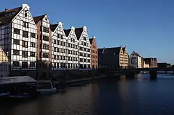 The Motława river is the oldest part of the trade port. On the eastern bank granaries had been erected since the 14th century. The number was growing up to 300. The island was created when the New Motława was dug out in 1576. In the Second World War, most of the granaries on the northern part were demolished during the siege of Danzig in March 1945.[1] During the war, from 1940 to 1945, the small Danzig Ghetto operated out of a building on the island.[2]