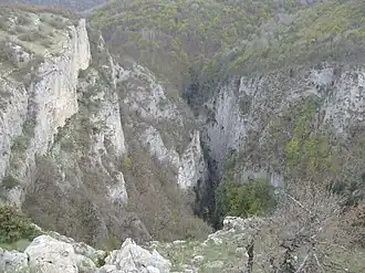 The Grand Canyon of Crimea was formed around 2 million years ago by a tectonic crack.[1] It is approximately 3 km (1.9 mi) long, and its walls, made of limestone, reach 320 m (1,050 ft) high.[2] At the bottom of the canyon, widths reach as thin as 2 m (6.6 ft).[3] The canyon is located between the Ai-Petri and Boyka massifs.[1] The walls of the canyon are home to a variety of different types of trees and herbs, but are prone to rock slides during dry weather and after rain.[3] On the Boyka side of the canyon is the Cathedral of Christ the Saviour, a ruined church Eastern Orthodox icons are placed.[4]