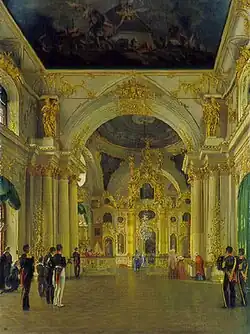 The Grand Church of the Winter Palace (Russian: Собор Спаса Нерукотворного Образа в Зимнем дворце) in Saint Petersburg, sometimes referred to as the Winter Palace's cathedral, was consecrated in 1763. It is located on the piano nobile in the eastern wing of the Winter Palace, and is the larger, and principal, of two churches within the palace. A smaller, more private church was constructed in 1768, near the private apartment in the northwest part of the wing. The Grand Church was designed by Francesco Rastrelli, and has been described as "one of the most splendid rooms" in the palace.[1] Today, the church is an unconsecrated exhibition hall of the State Hermitage Museum.[1]
