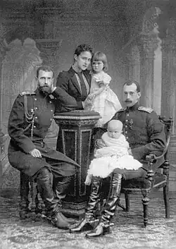 At birth, Dmitri had an older sister, Grand Duchess Maria Pavlovna, with whom he had a close relationship throughout his life. Grand Duke Paul was so distraught by the unexpected death of his young wife that he initially neglected his two small children: Dmitri and his older sister Grand Duchess Maria Pavlovna.[2] The children were therefore largely cared for by Paul's elder brother, Grand Duke Sergei Alexandrovich, and his wife Grand Duchess Elizabeth Feodorovna, who had no children of their own.[2] They spent Christmases and later some summer holidays with Grand Duke Sergei and Grand Duchess Elisabeth who set aside a playroom and bedrooms for the youngsters at their country home, Ilinskoe.