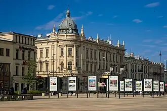 The building was constructed in the years 1899–1900, in just 17 months, for the Commercial Chamber of Lublin.[1] It was designed by Gustaw Landau, an architect working in Warsaw and Łódź, and a brother of one of the co-owners of the Commercial Chamber. It became a popular venue for business negotiations as well as meals. In 1910, the building got the architectural shape which has been preserved until today.[2] It was built in the eclectic style and features a Baroque dome, classicist colonnade and a Renaissance Revival attic.