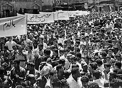 The mosque has been a gathering point for national protests for a century, with protestors routinely gathering in front of the mosque, listening to speeches, and afterwards marching to make their claims, including towards the nearby King Faisal Street. This phenomenon began in 1928 with the opposition to the 1928 Anglo-Jordan treaty, and included protests over Jordan's intentions to join the Baghdad Pact in 1955, price hikes in 1989, and against austerity in 1996, as well as celebrations over Algeria's independence in 1962, and solidarity marches with Iraq during the Gulf War in 1990. It also witnessed protests during the Arab Spring in 2011.[5]