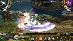 Combat uses a turn-based battle system. Units, together with additional objects such as barricades and traps, are positioned on one of three different horizontal lanes, which impact their ability to move and act.[1][7] The turn order is displayed on a timeline at the bottom of the battle screen.[2] During their turn, a unit's movement and attack duration are tied to separate action meters. Units attack using standard attacks and unique skills, and can defend if some action gauge remains at the end of a turn. Attacks are tied to button prompts, with proper timing and different button combinations raising damage and adding effects including stunning an enemy or shifting their position on the battlefield.[1][4][8] Moves can be undone as long as the controlled unit took no damage prior to performing the action.[5]