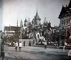 All Royal coronations since that of King Rama II have taken place within the walls of this building group.[29] Construction began in 1785 at the order of King Rama I, the original buildings only included the Chakraphat Phimarn Throne Hall and the Phaisan Thaksin Throne Hall. Later King Rama II carried out major constructions including the Amarin Winitchai Throne Hall and other extensions. Later in his reign he added the Sanam Chan Pavilion and the Narai Chinese Pavilion. King Nangklao (Rama III) renamed the buildings from Chakraphat Phiman (meaning 'Abode of the Chakravartin') to Maha Monthien (meaning 'Great Royal Residence'). He carried out major renovations and spent most of his reign residing in these buildings. King Rama IV later added two arch-ways at the north and west side of the walls called the Thevaphibal and Thevetraksa Gate respectively. King Vajiravudh (Rama VI) added two portico extensions to eastern and western sides of the Amarin Winitchai Hall.[31] Since then most buildings in its original plan remain, with occasional renovations being made before important anniversaries such as the Bangkok Bicentennial Celebrations in 1982. Except for the Amarin Winitchai Throne Hall, the rest of the complex is closed to the public.[9][30]