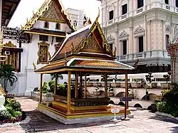 To the southeast is the Phra Thinang Racharuedee (พระที่นั่งราชฤดี; RTGS: Phra Thi Nang Ratcha Ruedi), a Thai-style pavilion constructed during the reign of King Rama VI as an outdoor audience chamber.[48] The pavilion was constructed for use especially during the birthday celebrations of the king. Originally King Rama IV had a two-story, European-style building constructed. Its purpose was to display gifts from foreign nations; however when this building became dilapidated King Rama V replaced it with a Chinese-style pavilion which was again dismantled and rebuilt. The present pavilion measures 12 by 7.80 metres (39.4 ft × 25.6 ft). The pediments are decorated with a gilded figures of Narayana on a garuda against a white mosaic background.[49][50]