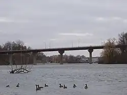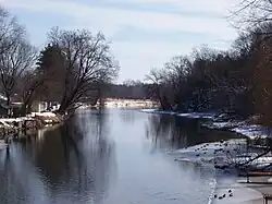 The Fox-Wisconsin Waterway's importance continued into the 1850s, when the Fox and Wisconsin Improvement Company built locks and dams on the Fox and the Portage Canal to connect it to the Wisconsin River at Portage.[7] The company was hoping to establish Green Bay as a port city to rival Chicago by making the Fox-Wisconsin Waterway into the principal shipping route between Lake Michigan and the Mississippi River. This goal was never achieved, as the Upper Fox remained too shallow for significant shipping even after damming and dredging. In addition, the lakes that the narrow, winding stream flows through were frozen solid for five months every year.[6]