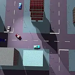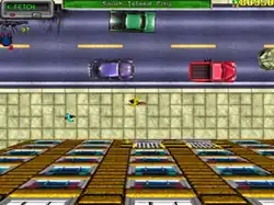 Grand Theft Auto is made up of six levels split between three main cities; each locale is based on a real-life city in the United States, with an alternative name: Liberty City (New York City), San Andreas (San Francisco), and Vice City (Miami). The progression is linear, as each level completed automatically unlocks the next one in the chain. Players begin a game choosing a character from among eight—four in the PlayStation version—and naming them, though the choice is purely aesthetic, and does not affect the overall gameplay.[6] In each level, the player's ultimate objective is to reach a target number of points, which starts at $1,000,000 but becomes higher in the later levels,[7] and then reach the level's "goal" to complete the stage. The player is free to do whatever they want,[8] but have limited lives upon doing so. Points can be gained from anything, such as causing death and destruction amid the traffic in the city, completing special challenges, or stealing and selling cars for profit. However, the more typical means to achieve their target is to perform tasks for the level's local crime syndicate. Jobs can be initiated by visiting and touching a ringing telephone box, with each level's set of jobs on offer being unique.[7]