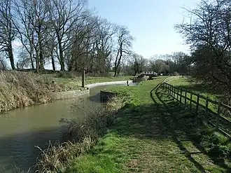 An act of Parliament, the Leicestershire and Northamptonshire Union Canal Act 1793 (33 Geo. 3. c. 98), was passed for the Leicestershire and Northamptonshire Union Canal: this was intended to link the Soar Navigation near Leicester to the River Nene near Northampton, and thus to the Grand Junction Canal via the latter's Northampton Arm.[3] The Leicestershire and Northampton union reached the village of Debdale by 1797, but in doing so had used up all of its money. James Barnes, an engineer working on the Grand Junction Canal, was asked in 1799 to find a route for the canal to reach the Grand Junction at Braunston. In 1802, he produced a revised proposal, to route the rest of the canal to Norton on the Grand Junction, with a branch to Market Harborough. Thomas Telford was then asked for his opinion, and he also proposed a change of destination to Norton, but via the town of Market Harborough. This was agreed upon, but by 1809, the canal had reached only Market Harborough, where construction came to an end again.[4]