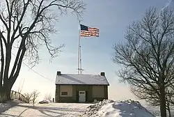 A shelter was constructed in Grandad Bluff Park in 1938 by the Works Progress Administration using stone quarried from the south side of the bluff. In 1941, a 65 ft (20 m) flagpole was erected by the La Crosse chapter of Reserve Officers Association using money raised by schoolchildren. Eleven years later, in 1952, a rustic split rail fence of native oak was constructed, along with two new picnic areas with parking. The shelter was wired with electricity in 1954, and public restrooms were constructed about ten years later. A new pump house was built in 1976. Landscaping projects were completed during the 1980s, and a new 75 ft (23 m) flagpole was erected by the La Crosse Jaycees in 1994.[5] In 2015, a statue of Ellen Hixon was dedicated on top of Grandad Bluff.[1]