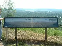 A park shelter in a fenced-off area atop the bluff provides visitors with a view of La Crosse. It contains a panoramic photo of La Crosse taken in 2004, with annotations of La Crosse landmarks. Locations visible from the bluff include the University of Wisconsin–La Crosse, the Mississippi River, bluffs in Minnesota, and Interstate 90.[2]