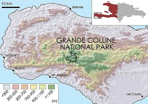 Grande Colline National Park (French: Parc National Naturel de Grande Colline) is a national park in Haiti established on July 23, 2014 with an area of 1,510 hectares.[1] The park contains the Grande Colline mountain range (Chaîne de la Grande Colline) at the core of the Occidental La Hotte Massif (Massif de la Hotte) in southwestern Haiti, west of Pic Macaya. There are five named peaks: Morne Desbarrières (1843 m), Morne Grande Colline (2025 m), Morne Petite Colline (1860 m), Morne Grenouille (2006 m), and Morne Lézard (1854 m).[1][2]