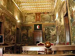 The Throne Room (Maltese: Is-Sala tat-Tron), originally known as the Grand Council Hall (Maltese: Is-Sala tal-Gran Kunsill, Italian: Sala del Maggior Consiglio) was built during the reign of Grandmaster Jean de la Cassière. It was used by successive Grandmasters to host ambassadors and visiting high ranking dignitaries. During the British administration it became known as the Hall of Saint Michael and Saint George after the Order of St Michael and St George which was founded in 1818 in Malta and the Ionian Islands.[20] It is currently used for state functions held by the President of Malta.