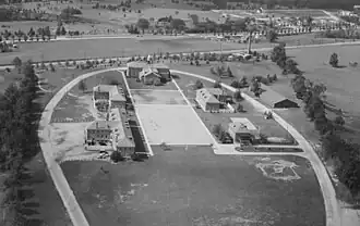 ![]() Aerial view of the school grounds c. 1953. The administration building and auditorium are located toward the top of the image. | |