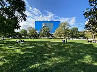 On July 10, 2017, after a cost of $15 million and construction lasting 15 months, a renovated Grange Park officially reopened with many improvements such as expansion of the children's play area, 80 new trees, expanded lawn area, an off-leash dog area, new public washrooms, new water features, and new seating areas. As part of the renovation, the Henry Moore sculpture Large Two Formspark was moved from the corner of Dundas and McCaul Streets to become the centrepiece of the park.[4] The park was designed by PFS Studio with Thinc Design as executive architects.[3] The AGO, the City of Toronto, the Weston Family, and various community groups jointly fininanced the renovation. There is also an endowment fund to support the park's long-term maintenance.[3]
