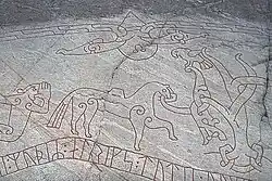 Grani is believed to be depicted on several of the Sigurd stones, which depict imagery from the legend of Sigurd the dragon slayer, including the inscription on Sö 327 in Gök, Södermanland County, Sweden.[2] In Norse iconography, the depiction of a horse carrying a chest was sufficient to represent Grani carrying the treasure after Sigurd had slain the dragon Fafnir.[3] This is supported by a kenning in a Norse poem that refers to "Grani's beauteous burden,"[4] indicating a common understanding of the motif.