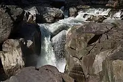 It is situated where the South Fork of the Stillaguamish River leaves its narrow mountain valley, which includes the namesake Granite Falls. The falls has a 540-foot (160 m) fishway and a 280-foot (85 m) tunnel that were built in 1954, at the time the longest fish tunnel in the world.[24] The area where the city was founded was called the "portage" by native tribes in the area, who used the flat area between the two rivers to portage their canoes when traveling.[25] Iron Mountain, which sits at 1,240 feet (380 m) above sea level, lies east of downtown and is home to a quarry.[26] The Rogers Belt, a series of local faults, runs northwest from Granite Falls towards Mount Vernon.[27]