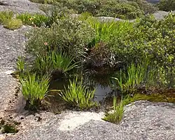 Pools of rainwater known as gnammas[5] often form on granite outcrops. These provide habitat to around 230 aquatic invertebrates, of which at least 50 are endemic to these pools,[6] and provide fresh water to other inhabitants and visitors.