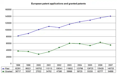 The EPO received its first application in 1978. The one millionth application was published on May 17, 2000,[115] and two millionth one on December 10, 2008.[116] Over 70% of the patent applications filed in 1991 have been finally granted.[117]