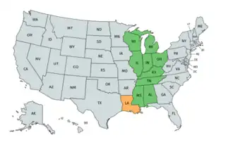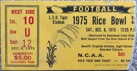 Louisiana Tech was eligible for the 1968 game because, in 1967, the NCAA moved the state of Louisiana from the Midwest Region to the Mideast Region.[6] In April 1969, the NCAA moved the bowl to Baton Rouge, where it was played at Memorial Stadium, a 21,500-seat facility. The Downtown Lions Club of Baton Rouge assumed the role of local sponsor.[7] With Bradshaw and Louisiana Tech again participating, the 1969 game drew a crowd of 16,000.[8] The 1970 game attracted a record 17,000 fans,[9] but local interest leveled off thereafter. Bowl organizers decided to keep the Grantland Rice name, even though the game's new home city and state had no connection to the late sportswriter. When the Rice Council of America was added as a sponsor, the name was shortened to the Rice Bowl, but only for the 1975 game.[10] Sportswriters covering the game took no notice, and continued to refer to it as the Grantland Rice Bowl.[11]
