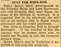 Sir William and Lady Emma were personal friends of the Royal Family. In 1937 Queen Mary stayed at Grantley Hall accompanied by her daughter Princess Mary and her son in law Lord Harewood. The visit was widely reported in the newspapers and one of these reports is shown.[22]