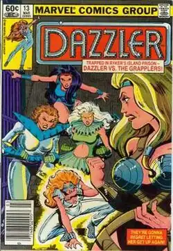 - ^ Fingeroth, Danny (w), Springer, Frank (Interior), Romita, John Jr. (cover) (p), Warfield, Don (col), Chiang, Janice (let), Shooter, Jim (ed). "Trial... And Terror!" Dazzler, vol. 1, no. 13 (March 1982). New York, NY: Marvel Comics.