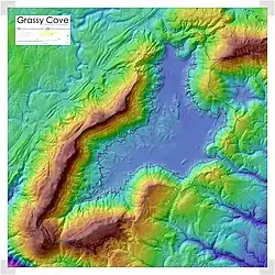 Grassy Cove is drained entirely by underground streams. The valley's main stream, Grassy Cove Creek, flows northward across the cove before dropping into Mill Cave on the slopes of Brady Mountain. Dye traces indicate that it flows south through a series of caves before reemerging at the head of the Sequatchie Valley[2] at Devilstep Hollow Cave, where it forms the headwaters of the Sequatchie River.[3] Grassy Cove Saltpeter Cave, located on the eastern slope of Brady Mountain, is the sixteenth longest cave in Tennessee[4] and one of the 100 longest caves in the United States.[5] Other caves in the cove include Windlass Cave, Bristow Cave, Mill Cave, Run to the Mill Cave, and Milksick Cave.