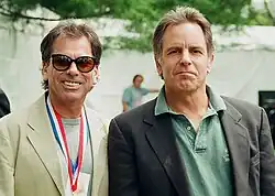 An extremely common feature in both Robert Hunter's lyrics, as well as the band's visual iconography, is the presence of dualistic and opposing imagery illustrating the dynamic range of the human experience (Heaven and hell, law and crime, dark and light, etc.). Hunter and Garcia's earlier, more directly psychedelic-influenced compositions often make use of surreal imagery, nonsense, and whimsey reflective of traditions in English poetry.[118] In a retrospective, The New Yorker described Hunter's verses as "elliptical, by turns vivid and gnomic", which were often "hippie poetry about roses and bells and dew".[119] Grateful Dead biographer Dennis McNally has described Hunter's lyrics as creating "a non-literal hyper-Americana" weaving a psychedelic, kaleidoscopic tapestry in the hopes of elucidating America's national character. At least one of Hunter and Bob Weir's collaborations, "Jack Straw", was inspired by the work of John Steinbeck.[120]