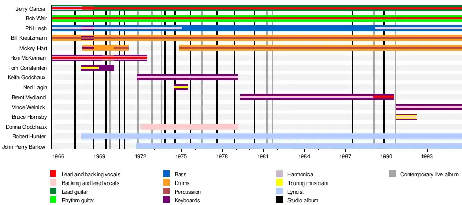 The Grateful Dead was founded in the San Francisco Bay Area during the rise of the counterculture of the 1960s.[9][10][11][12] The band's founding members were Jerry Garcia (lead guitar and vocals), Bob Weir (rhythm guitar and vocals), Ron "Pigpen" McKernan (keyboards, harmonica, and vocals), Phil Lesh (bass guitar and vocals), and Bill Kreutzmann (drums).[13] Members of the Grateful Dead, originally known as the Warlocks, had played together in various Bay Area ensembles, including the traditional jug band Mother McCree's Uptown Jug Champions. Lesh was the last member to join the Warlocks before they changed their name to Grateful Dead, replacing Dana Morgan Jr., who had played bass for a few gigs. Drummer Mickey Hart and non-performing lyricist Robert Hunter joined in 1967. With the exception of McKernan, who died in 1973, and Hart, who left the band from 1971 to 1974, the core of the band stayed together for its entire 30-year history.[14] Other official members of the band included Tom Constanten (keyboards from 1968 to 1970), John Perry Barlow (non-performing lyricist from 1971 to 1995),[15] Keith Godchaux (keyboards and occasional vocals from 1971 to 1979), Donna Godchaux (vocals from 1972 to 1979), Brent Mydland (keyboards and vocals from 1979 to 1990), and Vince Welnick (keyboards and vocals from 1990 to 1995).[16] Bruce Hornsby (accordion, piano, vocals) was a touring member from 1990 to 1992, as well as a guest with the band on occasion before and after the tours.