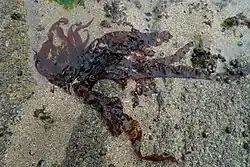 Grateloupia turuturu, commonly called the devil's tongue weed, is a marine species of Rhodophyta (red algae), a type of seaweed, native to East Asia (China, Japan, Korea) and parts of eastern Russia.[1] Due to global shipping and maritime activities, G. turuturu has become an invasive species that has altered natural communities by out-competing native seaweed species; this has resulted in habitat loss in many parts of the world, primarily in Australia, Northern Ireland, Great Britain, and the northeastern United States. Other common names for this species are the "red menace" and "red tide".[2]