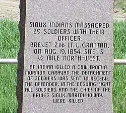 On the fourth day, the military asked Bordeaux to arrange a burial party. His team went to the scene and found that the slain soldiers had been ritually mutilated. Grattan's body was identified by his watch and was returned to the trading post for burial. The remains of the troops were interred at the site in a shallow mass grave.[13][14] The soldiers' remains were later exhumed (unburied) and re-interred at Fort McPherson National Cemetery, where a white marble monument was erected in their memory. Grattan's remains were moved later and reinterred to Fort Leavenworth National Cemetery in Kansas.[15] A historical marker was later erected about one-half mile from the site of the events.