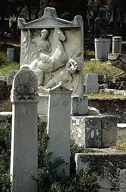 The Grave Stele of Dexileos is the stele of the tomb of an Athenian cavalryman named Dexileos (Ancient Greek: Δεξίλεως) who died in the Corinthian War against Sparta in 394 BC. The stele is attributed to "The Dexileos Sculptor". Its creation can be dated to 394 BC, based on the inscription on its bottom, which provides the dates of birth and death of Dexileos.[3] The stele is made out of an expensive variety of Pentelic marble and is 1.86 metres (6 ft 1 in) tall. It includes a high relief sculpture depicting a battle scene with an inscription below it. The stele was discovered in 1863 in the family plot of Dexileos at the Dipylon cemetery in the Kerameikos cemetery of Athens. It was found in situ, but moved during World War II, and is now on display in the Kerameikos Museum in Athens.[4]