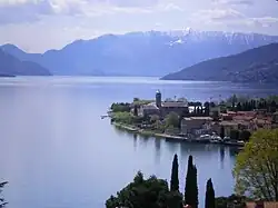 Gravedona is situated at the mouth of a gorge. The handsome Palazzo del Pero with four towers, at the upper end, was built in 1586 by Pellegrino Tibaldi for the Milanese Cardinal Tolomeo Gallio. Adjoining the venerable church of San Vincenzo rises the 12th century Romanesque Baptistery of Santa Maria del Tiglio, with campanile, containing two Christian inscriptions of the 5th century.[6]