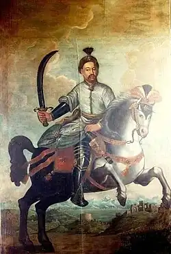 Over the centuries many works of art were collected in the mansion. The ceremonial hall was painted in the mid-nineteenth century by Giuseppe Lorenzo Gatteri, a fresco painter from Trieste.[1] The fresco on the ceiling depicts Apollo on a chariot.[7] Before World War II there was an important collection of work by the Venetian masters. The hall is reached by a richly stuccoed staircase from the left of the atrium. Three statues on the balustrade of the stairway represented sculpture, painting and architecture. One of these has been lost. Until 1967 there were four large equestrian portraits on the walls of this stairway: the Polish King John III Sobieski, Charles V, Duke of Lorraine the Austrian Emperor Leopold I and Prince Eugene of Savoy. The staircase today is hung with pictures of prominent members of the Gravisi family.[1]