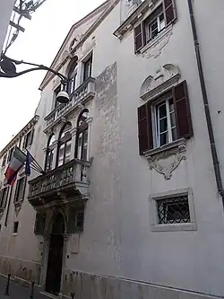 The mansion is packed in among other houses in a densely built area of the old town but the Baroque facade is visible at the end of a blind alley, a typical arrangement for the period.[2] Its facade fronts on the narrow Gallusova Street, with the north end jutting into the south of the roughly triangular Brolo square, once the center of medieval Koper. The square contains a large cistern fed by rainwater that supplies two stone fountains from the 15th century. Other buildings around the square are the Fontico (1392), formerly the city granary, the 14th century St. James's Church, Vissich–Nardi Mansion, Bishop's Mansion (Škofijska palača) and Brutti Mansion.[3] After World War II the square was converted into a park.[4] Since 2010 the square has been the venue for the Baladoor Jazz Festival.[5]