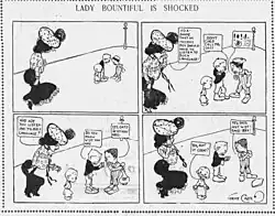 The first known grawlix appeared in November 1, 1901 story of Gene Carr's comic strip Lady Bountiful, with the title "Lady Bountiful is Shocked": the cartoon depicts two children arguing, with one of their speech bubbles simply containing the characters "!*!-!-" followed by a spiral with a line around it and a series of lines around a dot. The character of Lady Bountiful objects to "such language".[4]
