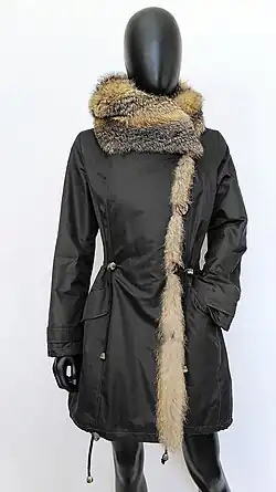 In 1911, the fur trader Emil Brass noted: “The fur cannot be used for lining, but only for stoles and muffs. The tail and claws cannot be used for anything other than complementing stoles. Sometimes the undercoat is also dyed dark blue, while the white tips retain their color. The current average value is about 10 marks per pelt.” In 1940, the Leipzig-based magazine “Kürschner-Zeitung” wrote “...they are natural or dyed blue and made into ties, chokers, hunting muffs and blankets, and recently also occasionally into jackets and capes”.[13][14] In 1986, in a scholarly book, it was said, in complete contrast to Brass, but obviously now very outdated in terms of its use, that the gray fox was of little value due to its short, rough hair and “is used for the lining of travel furs”.[Note 2][15]